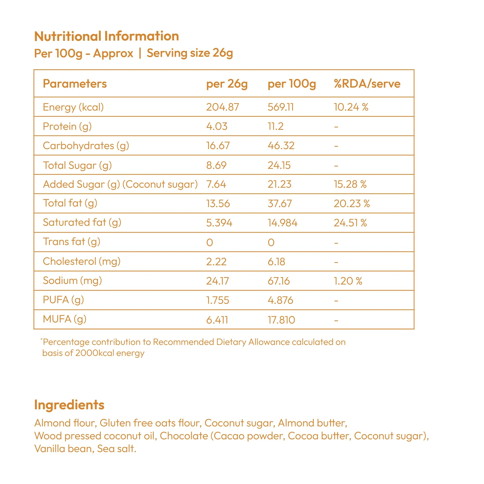 Almond flour, Gluten free oats flour, Coconut sugar, Almond butter, Wood pressed coconut oil, Chocolate (Cacao powder, Cocoa butter, Coconut sugar) Vanilla bean, Sea salt.